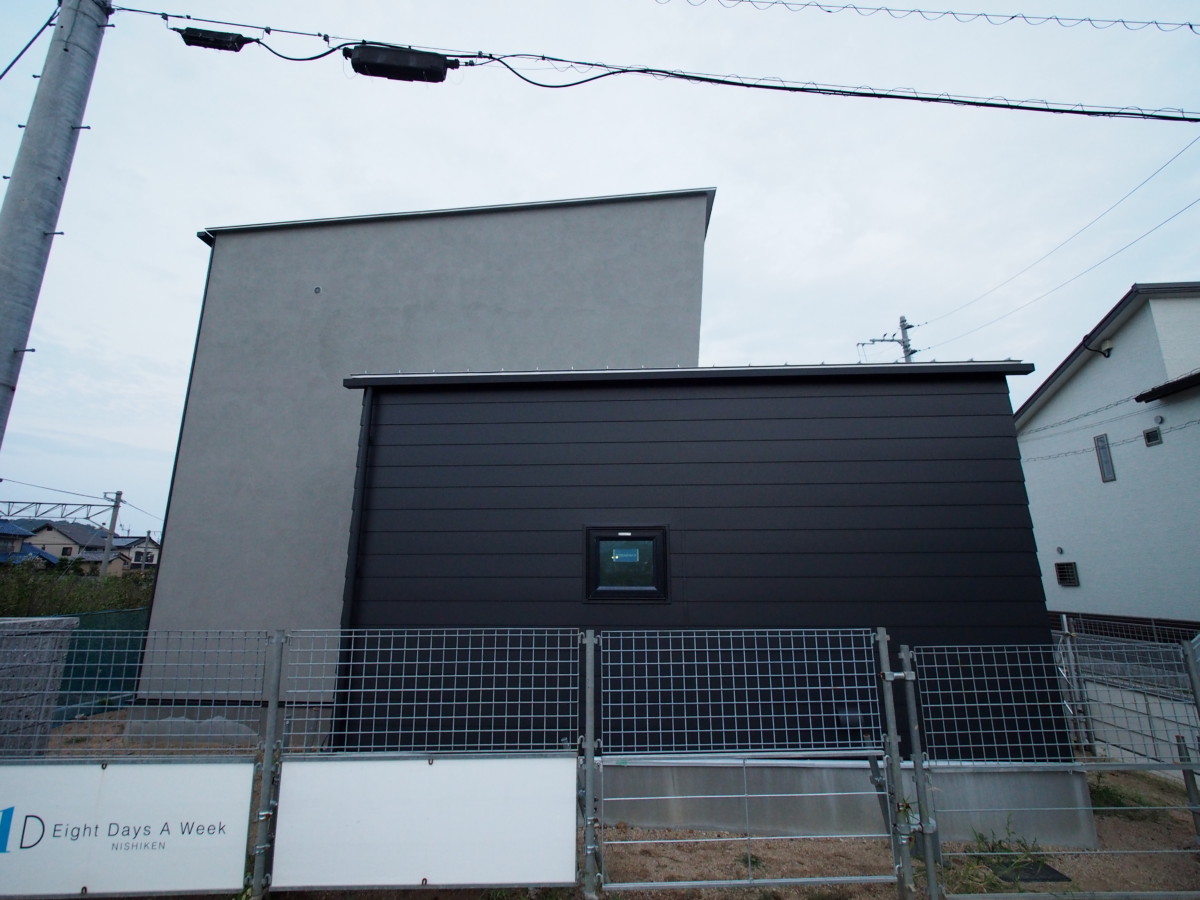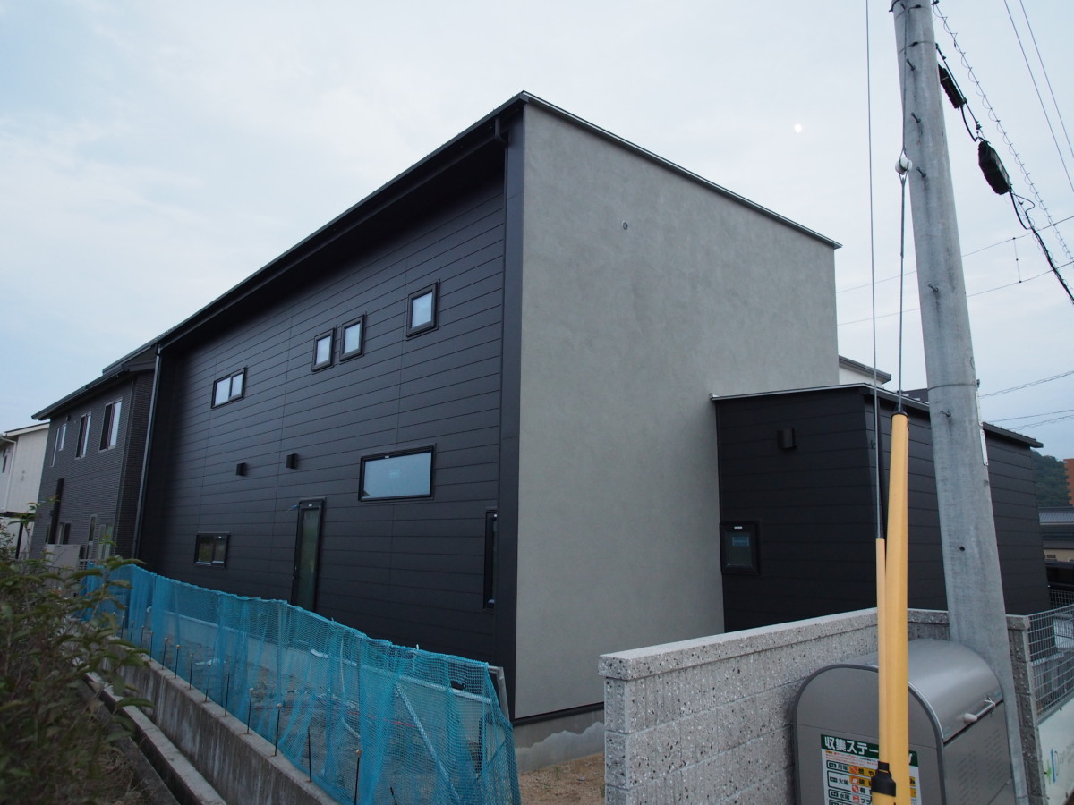 付加断熱塗仕上げ・ガルバ・鉄板サイディング・レッドシダーの板貼りがミックスされた外観